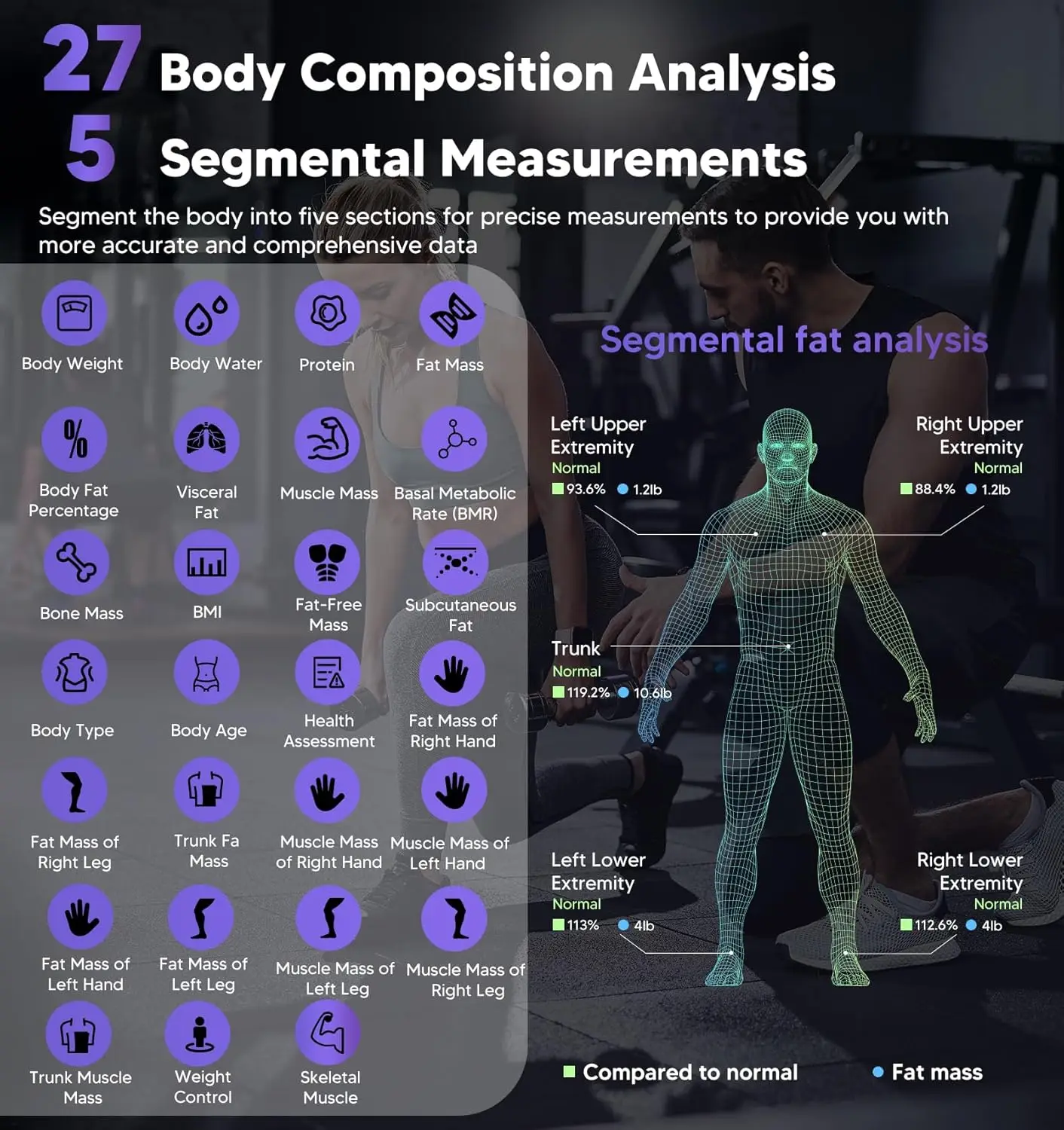 Experience comprehensive health monitoring with our advanced smart scale. Key features include: 1. **Advanced Technology for Precision**: This scale uses 8-electrode dual-frequency and segmental BIA technology to analyze the body in five sections (four limbs and torso), ensuring highly accurate measurements of body composition. 2. **Extensive Data Insights**: Track 27 essential metrics such as weight, BMI, body fat percentage, muscle mass, body water content, bone mass, protein levels, visceral fat, basal metabolic rate (BMR), skeletal muscle mass, subcutaneous fat, fat-free body weight, metabolic age, and more for a full-body analysis. 3. **Convenient Display and App Integration**: The HD LED display shows 7 key metrics directly on the scale after initial setup via the free companion app—no need to open the app each time. Monitor weight, BMI, body fat, body water, muscle mass, bone mass, and visceral fat easily at home or in the gym. 4. **User-Friendly Tracking and Sharing**: Download the free app to access detailed charts that save historical data over days to years. It integrates seamlessly with popular fitness apps like Apple Health (for iOS devices), Fitbit (for compatible trackers), and Google Fit (for Android users). Share progress with friends and family effortlessly. 5. **Unlimited User Support**: With a spacious weighing surface measuring 12.2 x 13.2 x 1.3 inches (310 x 336 x 33.8 mm), this scale supports unlimited users and can store up to nine profiles. It automatically recognizes individuals when they step on it—ideal for families or fitness groups aiming to improve health together. 6. **Safety Precautions**: Do not use if you have a pacemaker or any internal medical device implanted in your body; also avoid use during pregnancy to ensure safety. 7. **Calibration Tips for Accuracy**: For best results if you notice discrepancies in weight readings: step onto the scale briefly then off until it displays zero before taking your measurement—this ensures proper calibration every time.