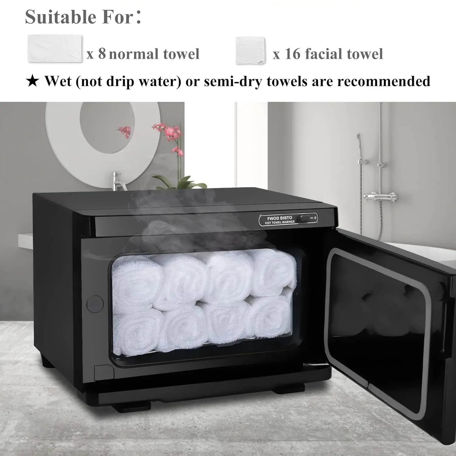Enhance your spa, salon, or barbershop experience with our efficient towel warmer. This compact cabinet is designed to provide warm towels on demand, perfect for facials and professional use. Key Features: - **Capacity**: Holds up to 8 standard towels or 16 facial towels, ideal for busy settings. - **Material**: Made with premium aluminum interior for durability and easy cleaning; includes a water tray to manage moisture. - **Temperature Control**: Automatically pauses at 175°F and reheats below 160°F to maintain consistent warmth without overheating. - **Specifications**: Operates at 120V/60Hz with 200W power; uses minimal energy while delivering reliable performance. - **Usage Tips**: Works best with semi-dry towels; not recommended for large bath towels due to size constraints. Benefits: - Start your day refreshed with a warm towel that cleanses the face and boosts energy levels. - Suitable for estheticians and professionals seeking a hygienic solution for client comfort. - Backed by a 2-year warranty for added peace of mind in your purchase. This product is crafted to meet the needs of various commercial environments, ensuring towels are always ready for use. Its user-friendly design makes it a valuable addition to any service-oriented business.