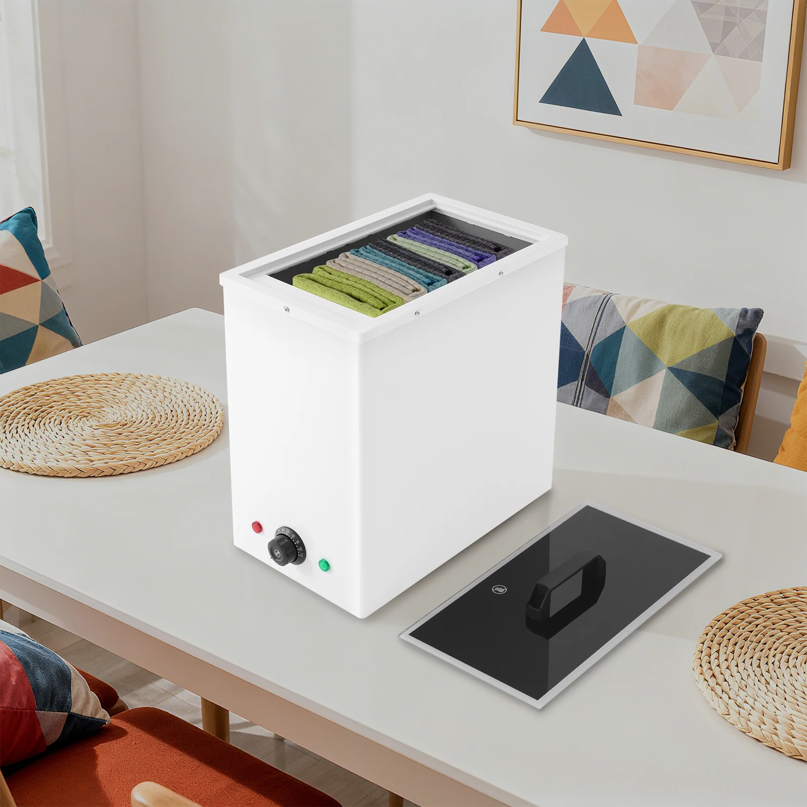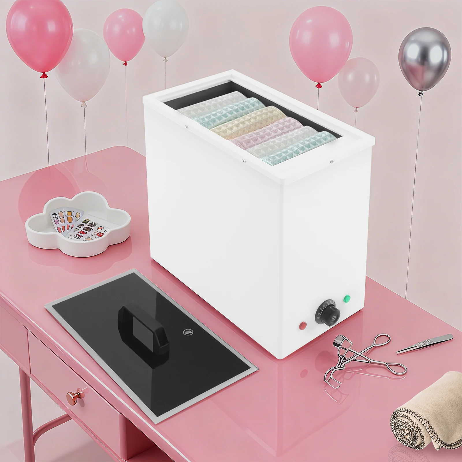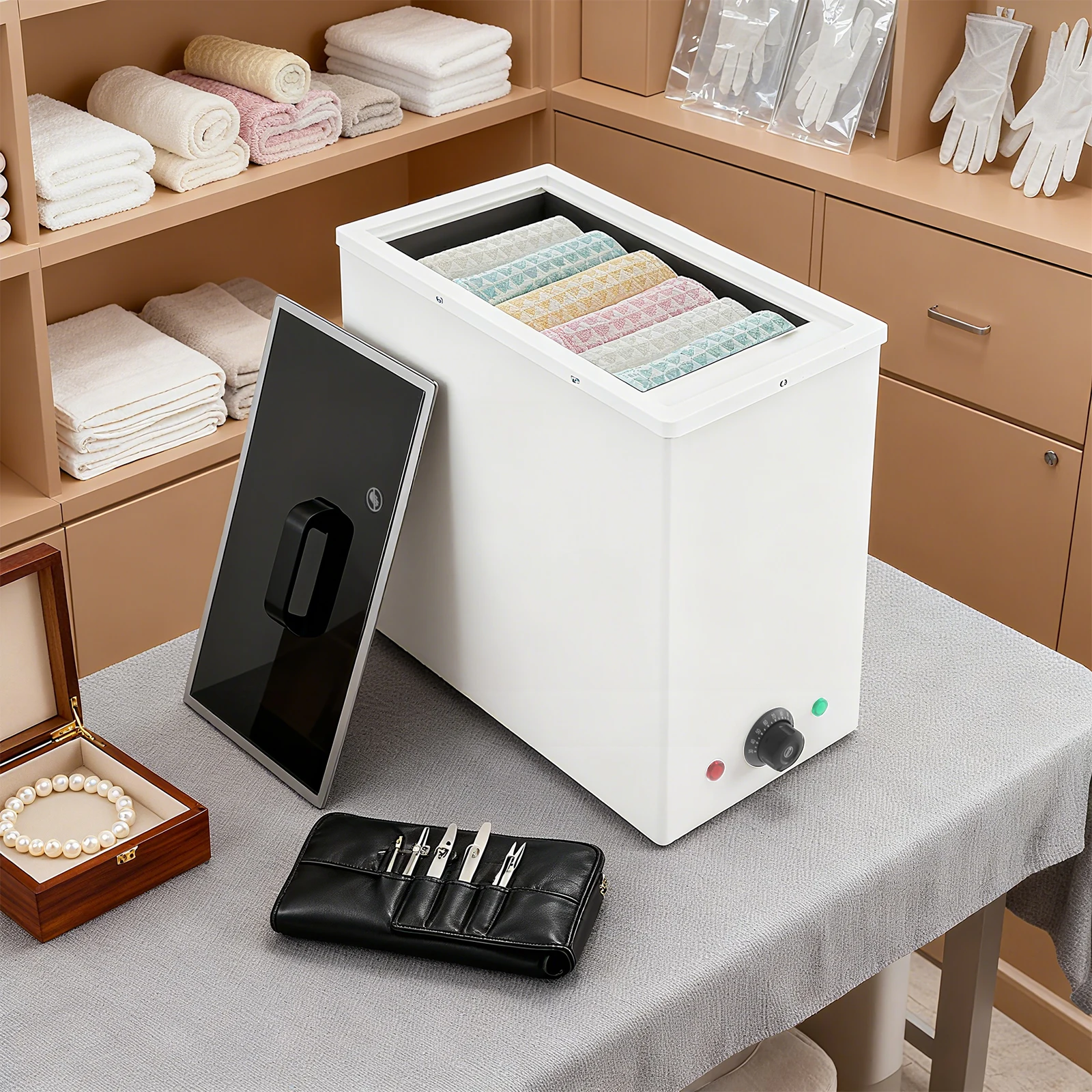 The product is suitable for massage rooms, spas, homes, restaurants, wellness centers, hotels, beauty salons, dental clinics, hair salons, and offices. It can heat both dry and wet towels, herbal packs, salt bags, energy stones, facial towels, bath towels, underwear, and more.